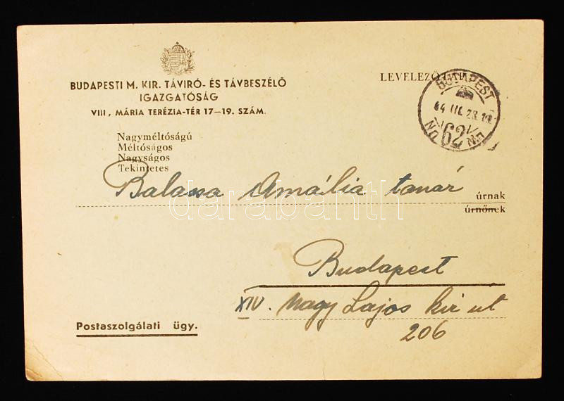 cca 1944 A Budapesti m. kir. távíró- és távbeszélő Igazgatóság által k... https://www.darabanth.com/hu/218-Gyorsarveres/218.0/Festmeny-mutargy-papirregiseg-egyeb/Okmanyok~200027/cca-1944-A-Budapesti-m-kir-taviro-es-tavbeszelo-Igazgatosag-altal-kikuldott-felszolC3~II913395