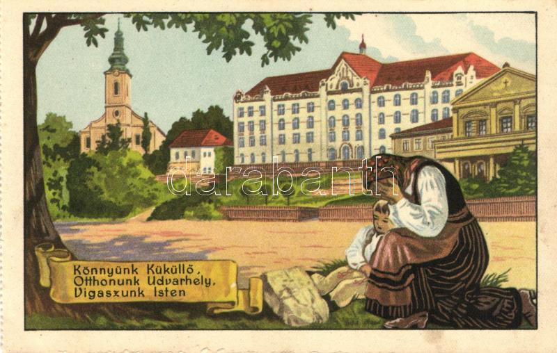 Leírás: Székelyudvarhely, Római katolikus főgimnázium és templom, folklór / grammar school and church, folklore, irredenta s: Gebhardt (EK)