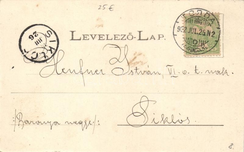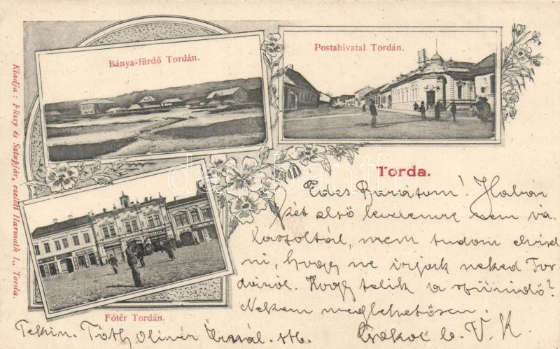 Leírás: Torda, Bányafürdő, posta, főtér; kiadja Füssy és Sztupjár / spa, post office, main square, floral