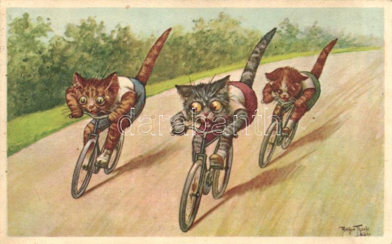 Bicycling cats, B.K.W.I. 323-4. s: Arthur Thiele (EK) https://www.darabanth.com/hu/218-Gyorsarveres/218.0/Kepeslapok/Macska~400084/Bicycling-cats-BKWI-323-4-s-Arthur-Thiele-EK~II929987
