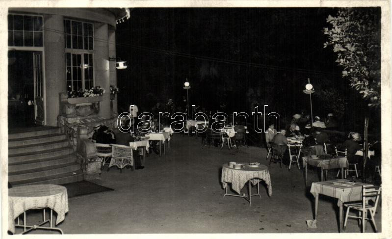 Leírás: Budapest III. Hármashatárhegy, Kilátó vendéglő, terasz, este