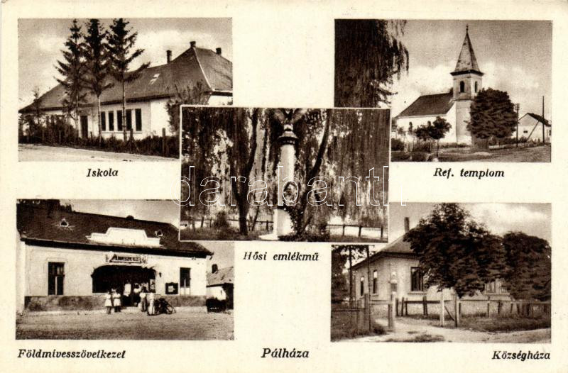 Leírás: Pálháza, Hősi emlékmű, földmívesszövetkezet, iskola, református templom, községháza