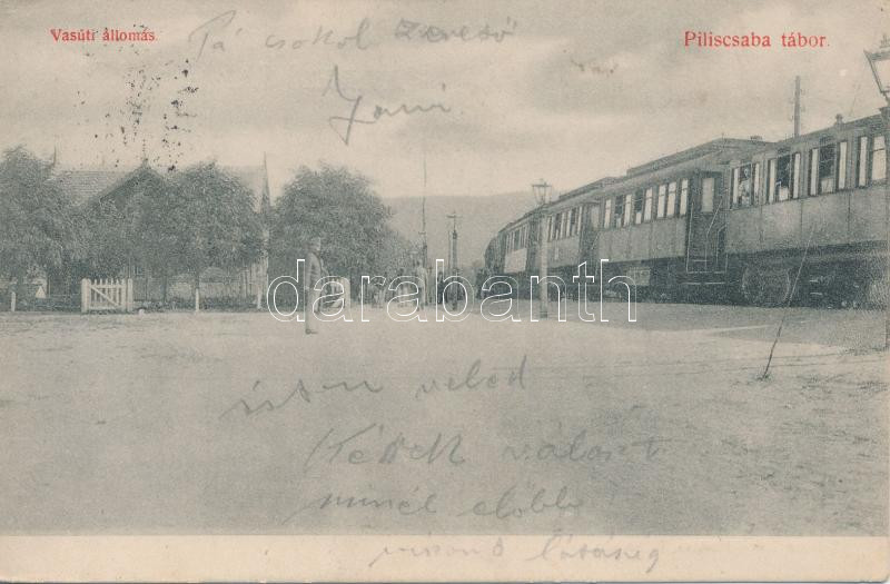 Piliscsaba, tábor, vasútállomás, vonat, kiadja Kriston József https://www.darabanth.com/hu/218-Gyorsarveres/218.0/Kepeslapok/Magyarorszag~400005/Piliscsaba-tabor-vasutallomas-vonat-kiadja-Kriston-Jozsef~II927380