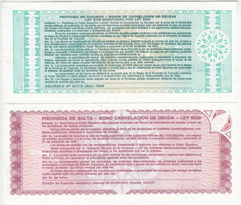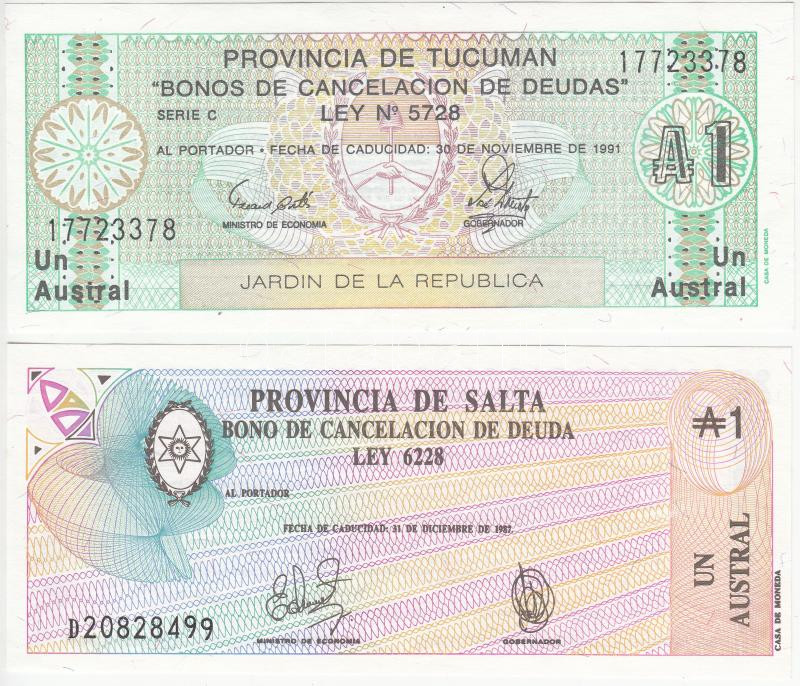 Argentina 1987. 1 Austral "Provincia de Salta" + 1991. 1 Austral "Provincia de Tucuman" C:UNC