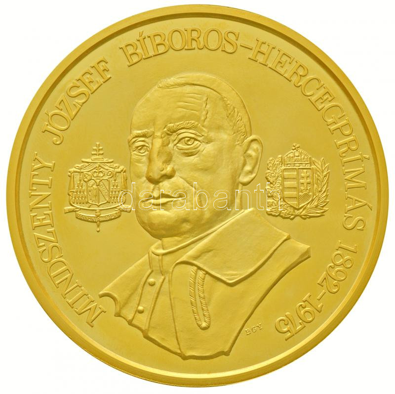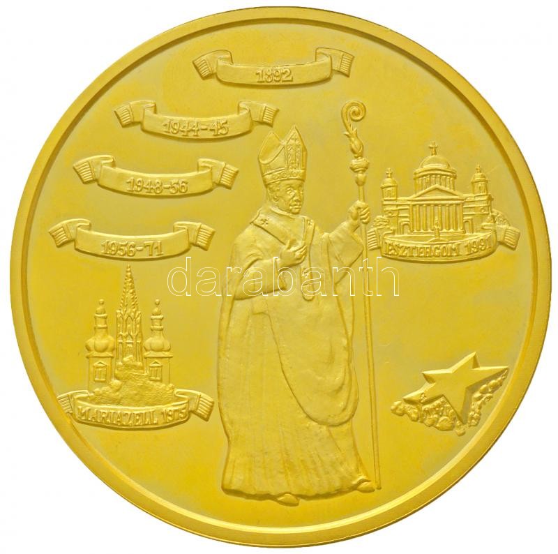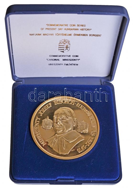 Bognár György (1944-) 1991. "Mindszenty József Bíboros Hercegprímás 1892-1975" aranyozott emlékérem a "Napjaink Magyar Történelme Érmekben" sorozatból, eredeti adományozói dísztokban (65mm) T:PP ujjlenyomatos