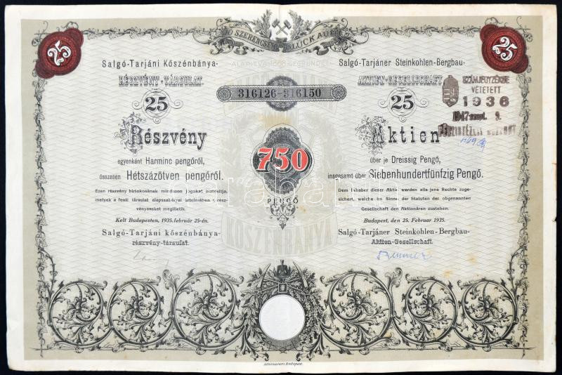 Leírás: Budapest 1935. "Salgó-Tarjáni Kőszénbánya Részvény-Társulat" részvénye 750P-ről, szelvényekkel, szárazpecséttel, felülbélyegezve T:II-