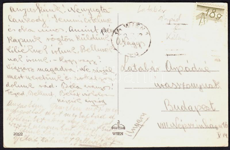 cca 1920-1930 Latabár Kálmán (1902-1970) és ifj. Latabár Árpád (1903-1961) színészek üdvözlő sorai és aláírásai Bécsből édesanyjuknak írt levelezőlapon.
