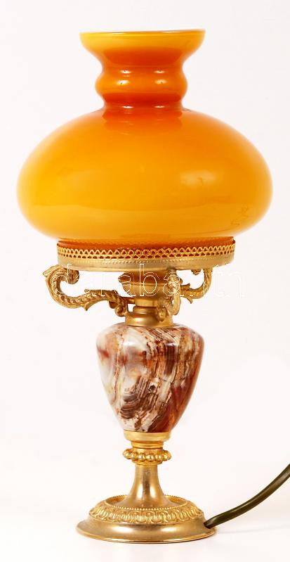 Leírás: Asztali lámpa, réz, alabástrom, hibátlan üvegburával, m:29 cm