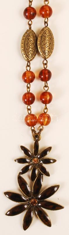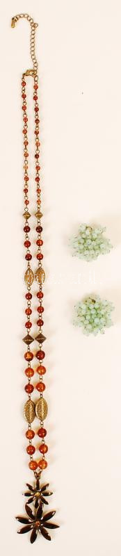 Leírás: Barna virágos nyaklánc, h: 76 cm, 1 pár zöld fülklipsz