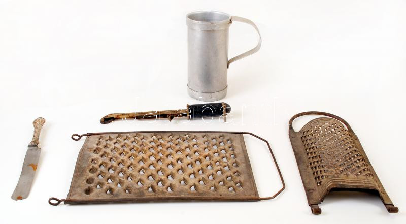 Leírás: Régi háztartási eszközök, benne kés, nokedli szaggató, reszelő, 5 dl-es kimérő edény, összesen: 5 db