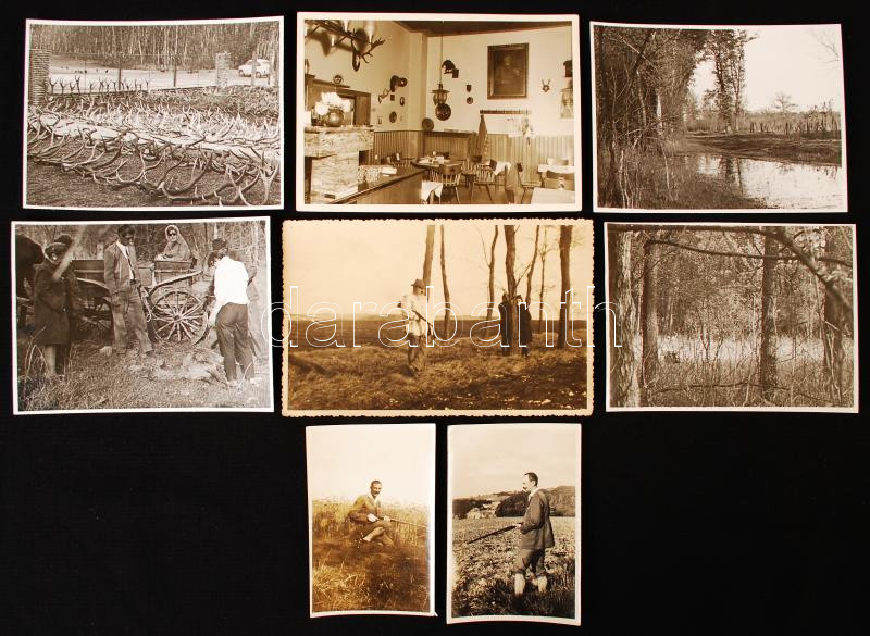 Leírás: 1930-1932 7 db vadászattal kapcsolatos fotó: leterített vad, trófeák, vadászok, 6x9 és 13x9 cm közötti méretekben