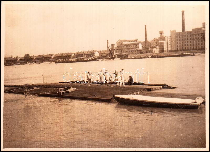 Leírás: cca 1940 Bp., Sportolók a Margitszigeten, háttérben az angyalföldi Erzsébet Gőzmalommal, 11x8 cm