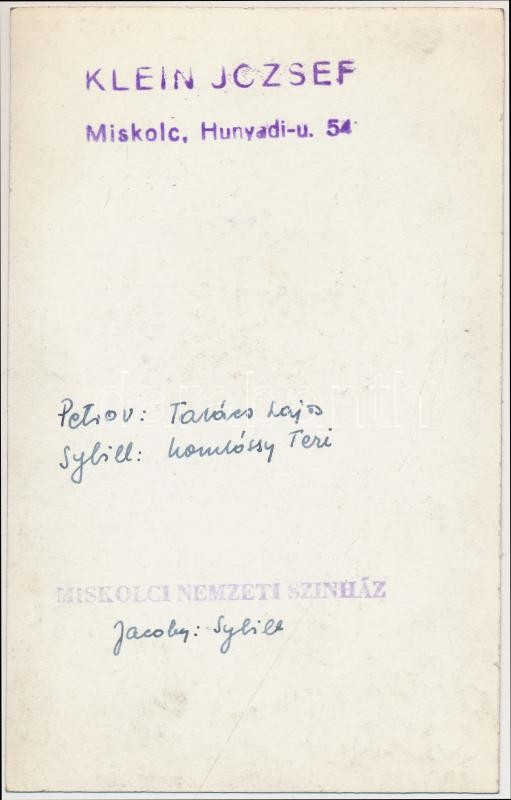 cca 1960-1970 Klein József: Takács Lajos (Petrov), Komlóssy Teri (Sybi... https://www.darabanth.com/hu/219-Gyorsarveres/219.0/Festmeny-mutargy-papirregiseg-egyeb/Foto~500035/cca-1960-1970-Klein-Jozsef-Takacs-Lajos-Petrov-Komlossy-Teri-Sybill-a-Miskolci-Nemzeti-Szi~II931742