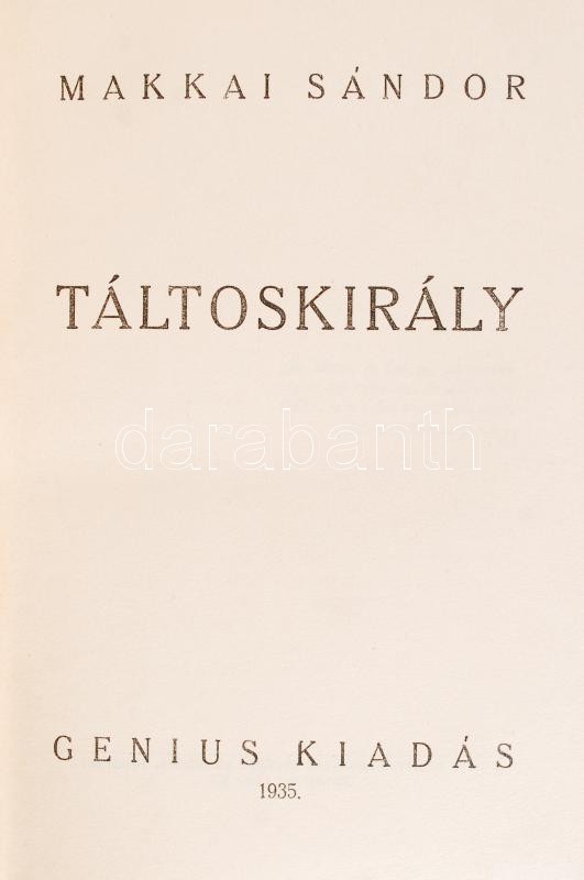 Makkai Sándor: Táltoskirály. Bp., [1935], Genius. Kiadói halinakötésbe... https://www.darabanth.com/hu/219-Gyorsarveres/219.0/Festmeny-mutargy-papirregiseg-egyeb/Konyvek-Erdelyi-Szepmives-Ceh-kiadasai~500012/Makkai-Sandor-Taltoskiraly-Bp-1935-Genius-Kiadoi-halinakotesben-jo-allapotban~II936128