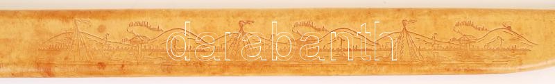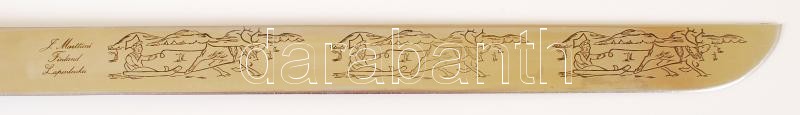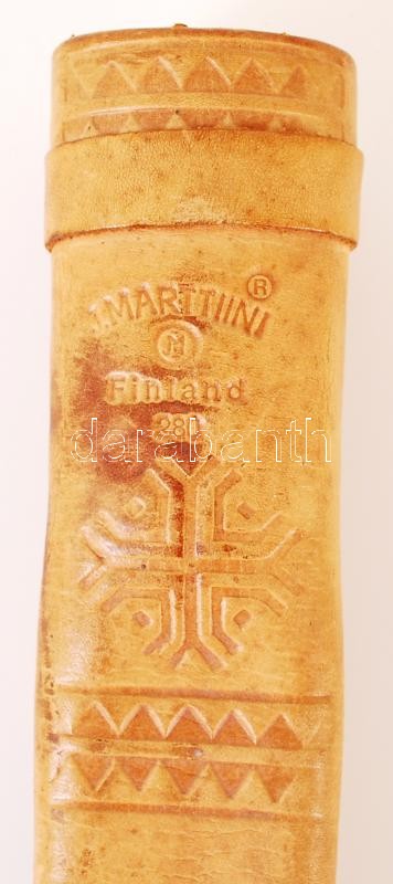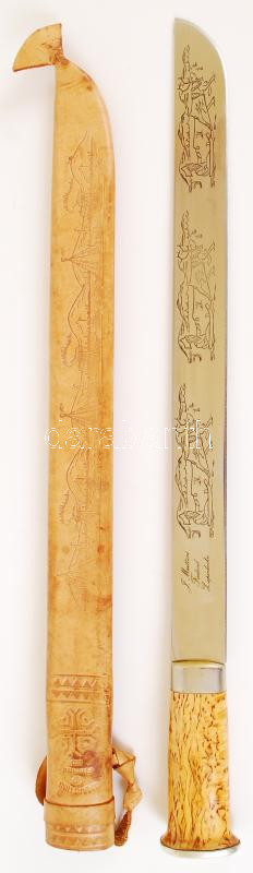 Leírás: Marttini finn bozótvágó, díszített pengével, gravírozott, topolyagyökér markolattal, bőr hüvelyben, h:56 cm