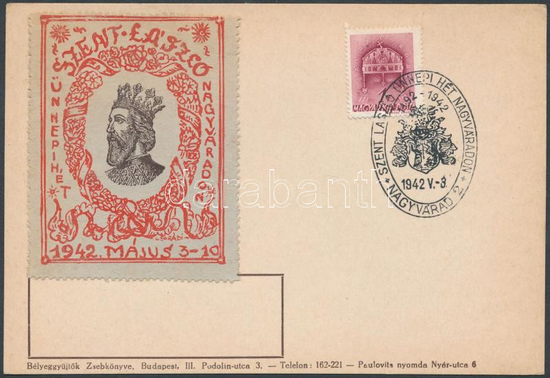 1942 Szent László levélzáró emlékbélyegzős papírlapra felragasztva https://www.darabanth.com/hu/219-Gyorsarveres/219.0/Festmeny-mutargy-papirregiseg-egyeb/Parafilatelia~500024/1942-Szent-Laszlo-levelzaro-emlekbelyegzos-papirlapra-felragasztva~II935556