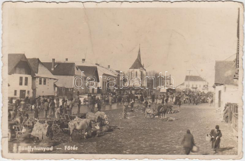 Bánffyhunyad, Fő tér, piac / square, market (b) https://www.darabanth.com/hu/219-Gyorsarveres/219.0/Kepeslapok/Erdely~300006/Banffyhunyad-Fo-ter-piac-square-market-b~II932258
