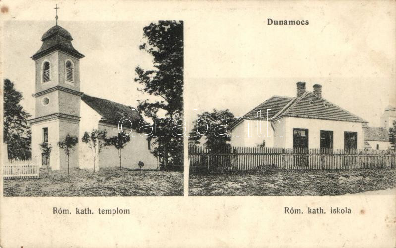 Leírás: Dunamocs, Római katolikus templom és iskola, kiadja Lajos Mihály / Roman Catholic church and school (fa)