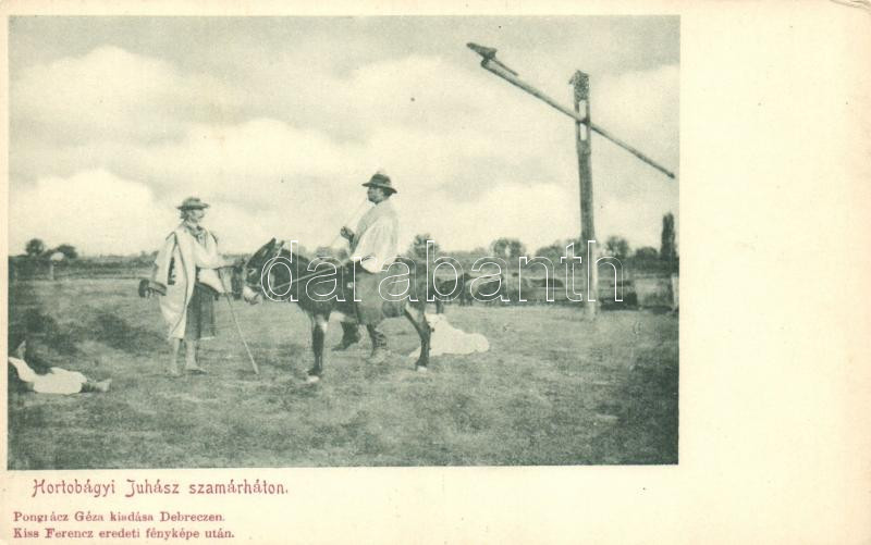 Leírás: Hortobágy, juhász szamárháton, gémeskút, Pongrácz Géza kiadása, Kiss Ferenc eredeti fényképe után