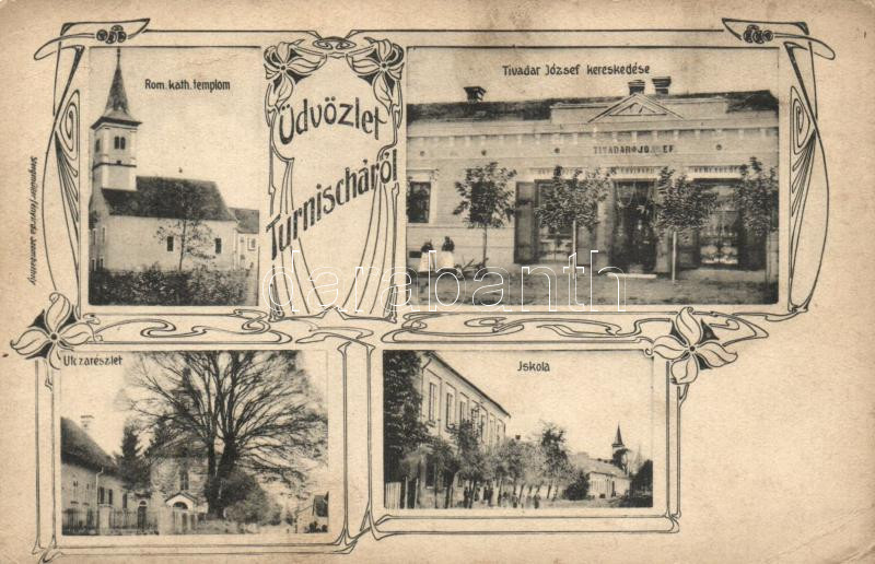 Leírás: Bántornya, Turnischa; Tivadar József kereskedése, iskola, utca / shop, school, street Art Nouveau (EB)