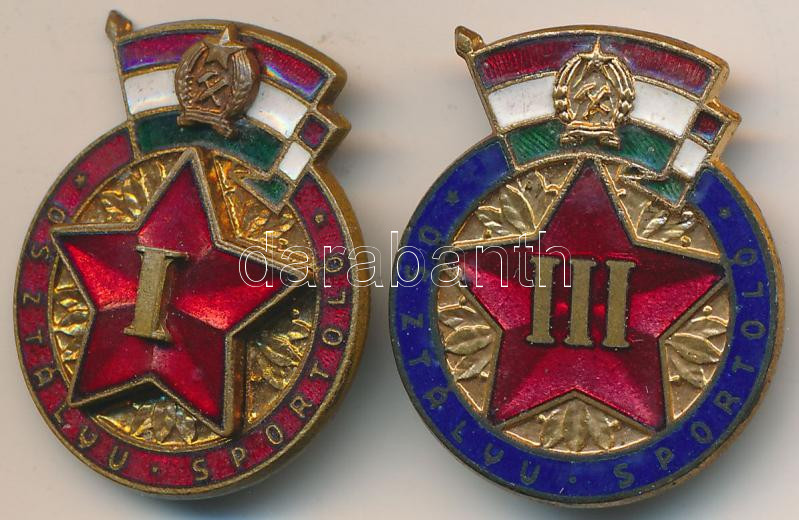 Leírás: ~1950. "I. Osztályú Sportoló" + "III. Osztályú Sportoló" zománcozott fém kitüntető jelvények T:2