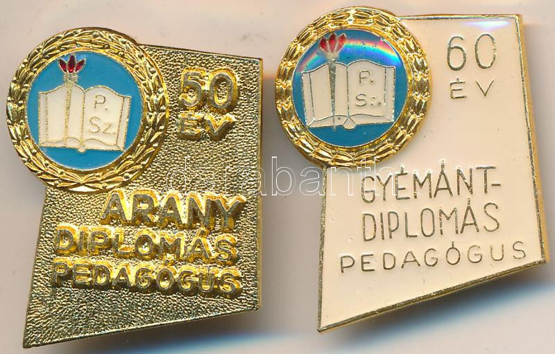 Leírás: ~1980. "Aranydiplomás Pedagógus - 50 év" + "Gyémántdiplomás Pedagógus - 60 év" aranyozott, zománcozott fém jelvény T:1-,2