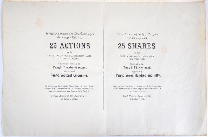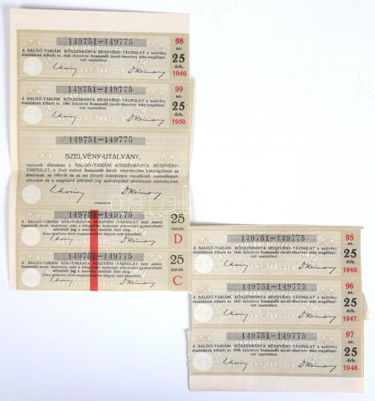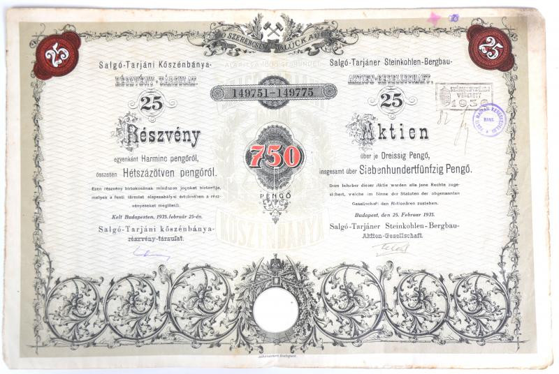 Budapest 1935. "Salgó-Tarjáni Kőszénbánya Részvény-Társulat" részvénye egyenkéknt 30P-ről, összesen 750P-ről, szárazpecséttel, bélyegzéssel és szelvényekkel T:III