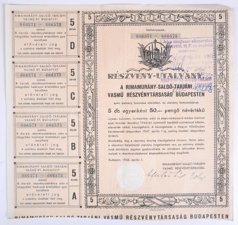 Leírás: Budapest 1946. "Rimamurány-Salgó-Tarjáni Vasmű Részvénytársaság Budapesten" részvényutalványa 5db egyenként 50P értékű részvényről bélyegzéssel T:III
