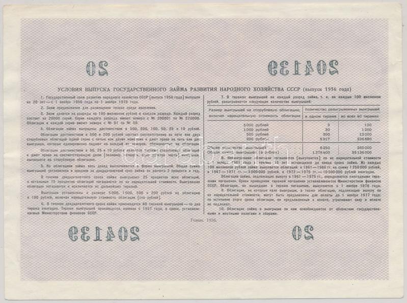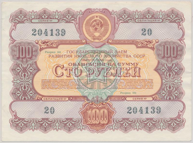 Szovjetunió 1956. 100R nyereménykölcsön, amely egyben pénzhelyettesítő fizetőeszköz is volt T:II- hajtatlan