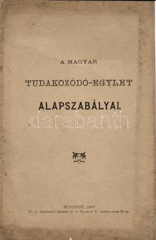 1897 A Magyar Tudakozódó Egylet alapszabályai; Kálmán M. és tsa. https://www.darabanth.com/hu/22-Gyorsarveres/22.0/Festmeny-mutargy-papirregiseg-egyeb/Nyomtatvanyok~183/1897-A-Magyar-Tudakozodo-Egylet-alapszabalyai-Kalman-M-es-tsa~II43168