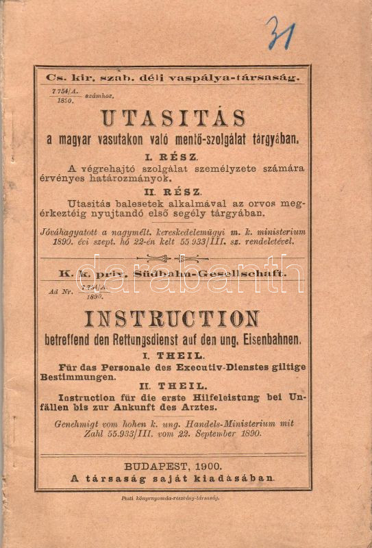 Leírás: 1900 Cs. kir. szab. déli vasútpályatársaság: Utasítás a magyar vasútakon való mentő szolgálat tárgyában, magyar és német nyelven