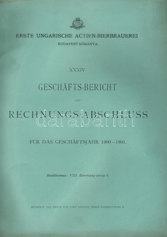 Leírás: 1901 A Kőbányai Első Magy. Sörfőző Rt. üzleti jelentése német nyelven; Kertész József nyomdája