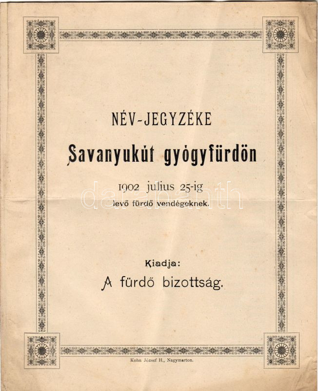 1902 A Savanyukút gyógyfürdőn lévő fürdő vendégek névjegyzéke; Kohn Jó... https://www.darabanth.com/hu/22-Gyorsarveres/22.0/Festmeny-mutargy-papirregiseg-egyeb/Nyomtatvanyok~183/1902-A-Savanyukut-gyogyfurdon-levo-furdo-vendegek-nevjegyzeke-Kohn-Jozsef-Nagymarton~II42993