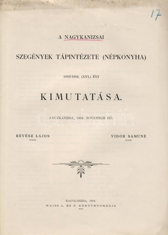 1904 A Nagykanizsai Szegények Tápintézete (népkonyha) kimutatása; Weis... https://www.darabanth.com/hu/22-Gyorsarveres/22.0/Festmeny-mutargy-papirregiseg-egyeb/Nyomtatvanyok~183/1904-A-Nagykanizsai-Szegenyek-Tapintezete-nepkonyha-kimutatasa-Weiss-L-es-F-nyomdaja~II42920
