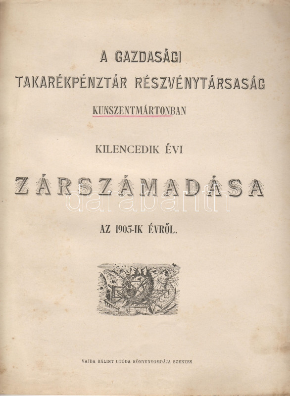 Leírás: 1906 A Kunszentmártoni Gazdasági Takarékpénztár Rt. zárszámadása; Vajda Bálint útóda nyomdája