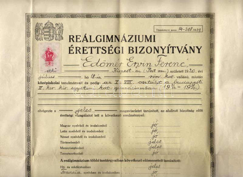 1939 Reálgimnáziumi Érettségi Bizonyítvány kitöltve https://www.darabanth.com/hu/22-Gyorsarveres/22.0/Festmeny-mutargy-papirregiseg-egyeb/Nyomtatvanyok~183/1939-Realgimnaziumi-Erettsegi-Bizonyitvany-kitoltve~II43160