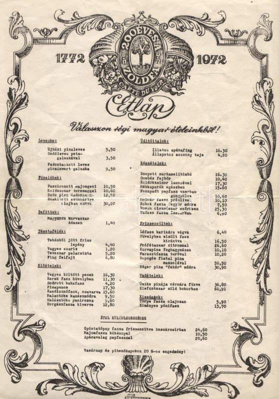 1972 A Zöldfa étterem étlapja https://www.darabanth.com/hu/22-Gyorsarveres/22.0/Festmeny-mutargy-papirregiseg-egyeb/Nyomtatvanyok~183/1972-A-Zoldfa-etterem-etlapja~II42987