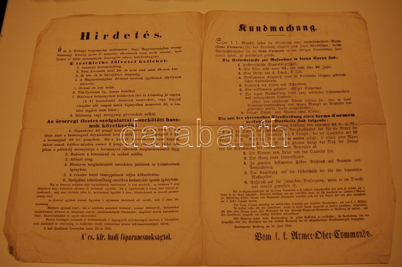 Leírás: Hirdetmény országbiztonsági őrsereg (csendőrség) felállításáról magyar-német nyelven, Cs. kir. Hads. Főparancsnokság Pozsony, 1949 június 22. (gyűrött)