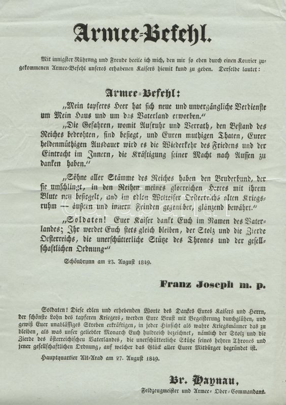 I. Ferenc József hadseregparancsa német nyelven 1849 8. 23. https://www.darabanth.com/hu/22-Gyorsarveres/22.0/Festmeny-mutargy-papirregiseg-egyeb/Nyomtatvanyok~183/I-Ferenc-Jozsef-hadseregparancsa-nemet-nyelven-1849-8-23~II42636