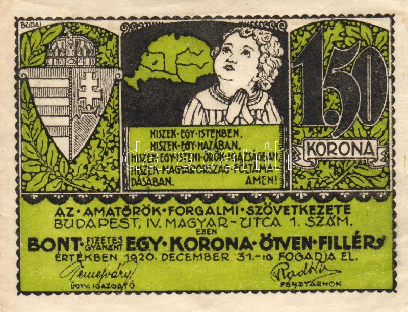 1920 "Amatőrök..." 50f, 1,50K szükségpénz irredenta rajzolattal és ké... https://www.darabanth.com/hu/22-Gyorsarveres/22.0/Numizmatika/Magyar-es-kulfoldi-bankjegyek~167/1920-Amatorok-50f-1-50K-szuksegpenz-irredenta-rajzolattal-es-keppel-2db-TI-RR~II39276