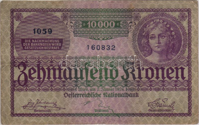 Ausztria 1924 10.000K T:II https://www.darabanth.com/hu/22-Gyorsarveres/22.0/Numizmatika/Magyar-es-kulfoldi-bankjegyek~167/Ausztria-1924-10000K-TII~II40320
