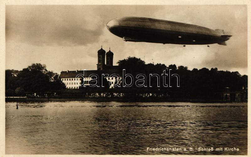 Friedrichshafen; Schloss mit Kirche und Graf Zeppelin / airship https://www.darabanth.com/hu/22-Nagyaukcio/22.1/Kulfoldi-kepeslapok/Nemetorszag~8815/Friedrichshafen-Schloss-mit-Kirche-und-Graf-Zeppelin-airship~II1036183