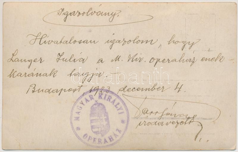 Leírás: 1923 Bp, Langer Júlia az Operaház énekkarából, hátoldalán igazolással, 14x9 cm