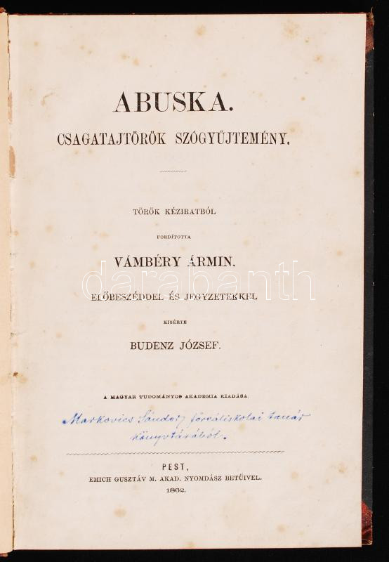 Leírás: Abuska. Csagatajtörök szógyűjtemény. Ford.: Vámbéry Ármin, jegyz. Budenz József. Pest, 1862, Emich Gusztáv. Markovics Sándor (1856-?) főreáliskolai tanár, szakíró tulajdonosi bejegyzésével és lapszéli jegyzeteivel. Kopott, aranyozott félvászon kötésben, egyébként jó állapotban.