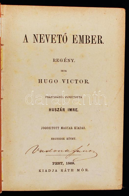 Victor Hugo: A nevető ember. Ford: Huszár Imre. IV. kötet. Pest 1869. ... https://www.darabanth.com/hu/220-Gyorsarveres/220.0/Festmeny-mutargy-papirregiseg-egyeb/Konyvek-Egyeb-ritkasagok~10027/Victor-Hugo-A-neveto-ember-Ford-Huszar-Imre-IV-kotet-Pest-1869-Rath-Mor-392p-Belul-el~II942005