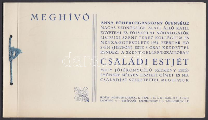 Leírás: 1934 Meghívó az Anna főhercegasszony védnöksége alatt álló Kath. Egyetemi és Főiskolai Nőhallgatók által rendezett családi estre