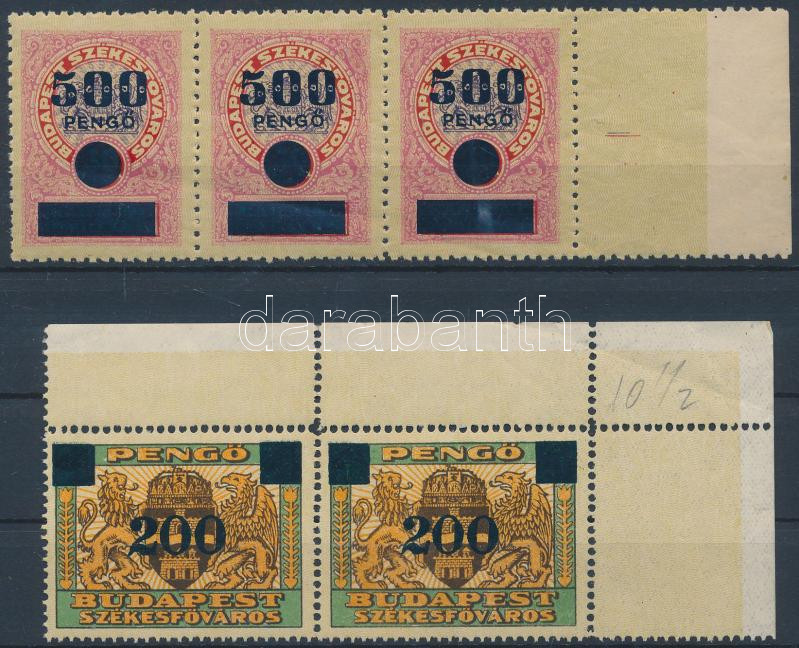 Leírás: 1945 Budapest Székesfőváros városi illetékbélyeg 200P párban, 500P hármascsíkban