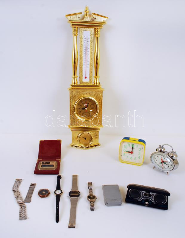 Leírás: Óra tétel, benne fali-, ébresztő-, karórák (9 db), részben működőképes, óra alkatrészek, színházi látcső (1 db)