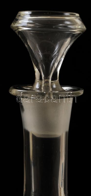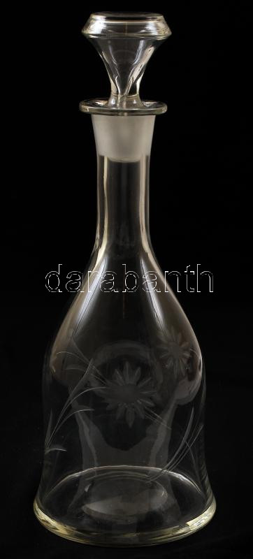 Leírás: cca 1900 Csiszolt, virágmintás borosüveg, üveg dugóval 30 cm
