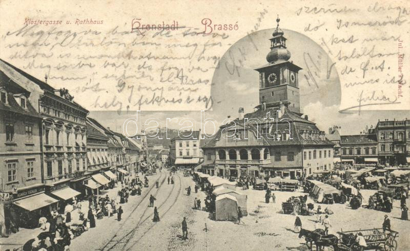 Leírás: Brassó, Kronstadt; piac, Kolostor utca, Városháza, Heinrich Tischler, Borbély Antal és Goldmann üzlete / market place, szteet, town hall, shops